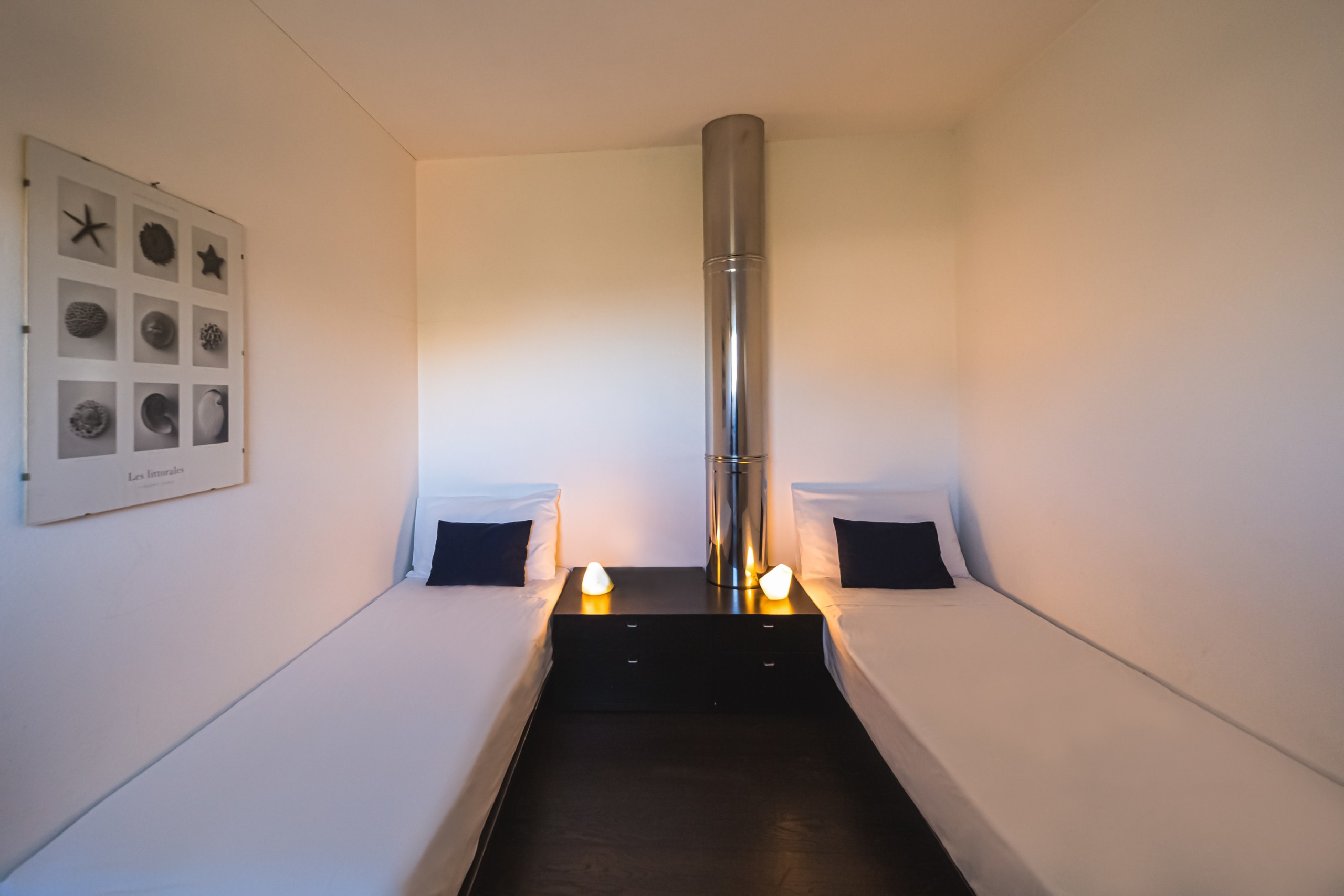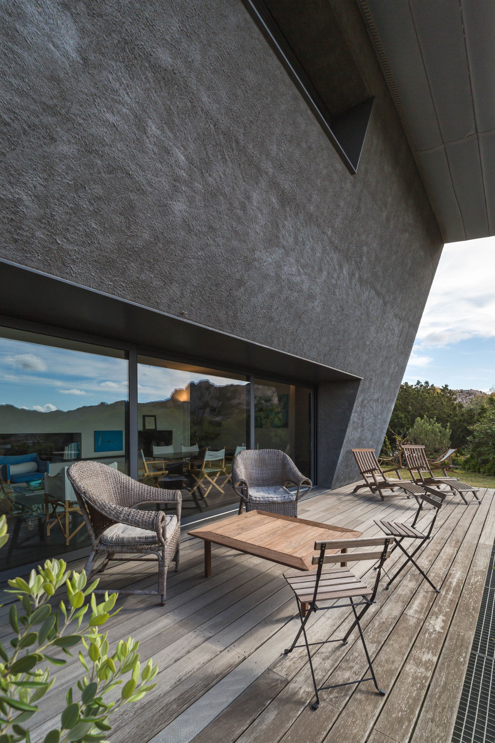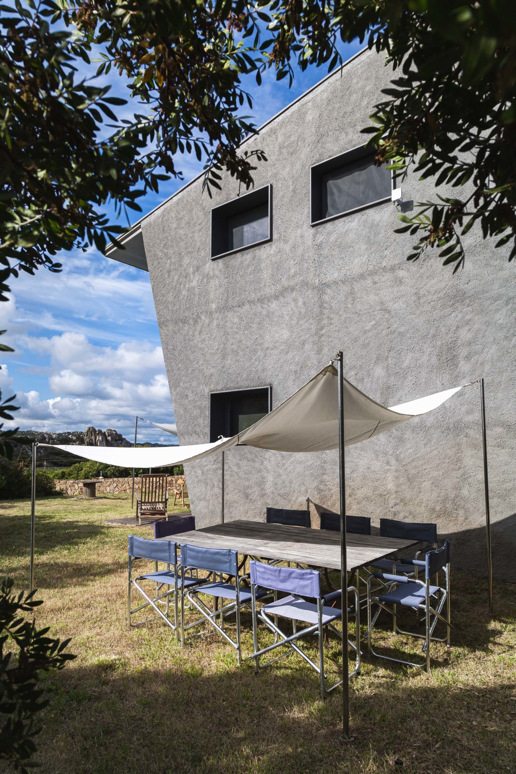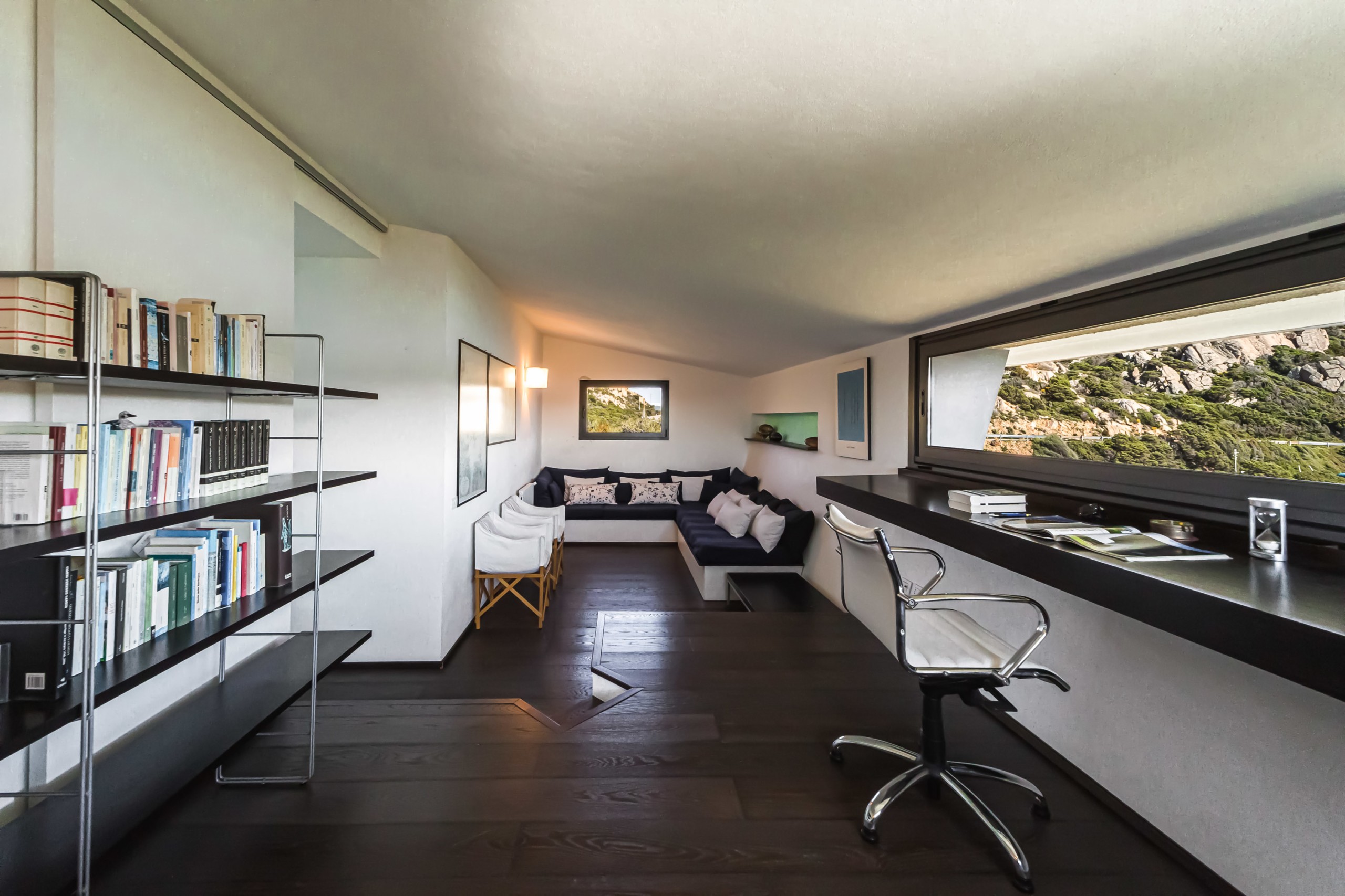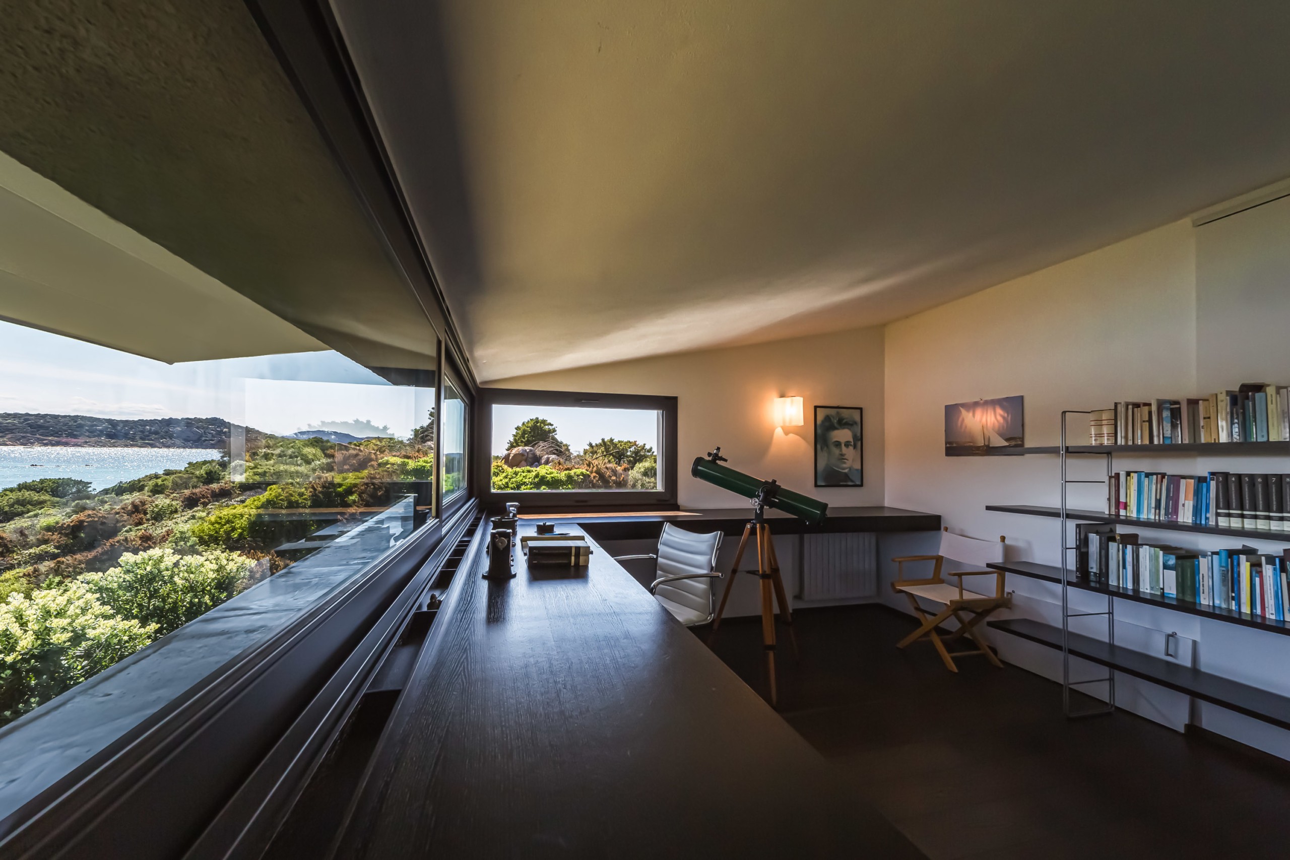 Costruzione inclinata in avanti, che sfrutta maggiormente le misure interne, ombreggiando la zona esposta verso sud. Le aperture a terra ed al piano superiore studiate per relazionare gli interni e la vista sul golfo e sul mare.