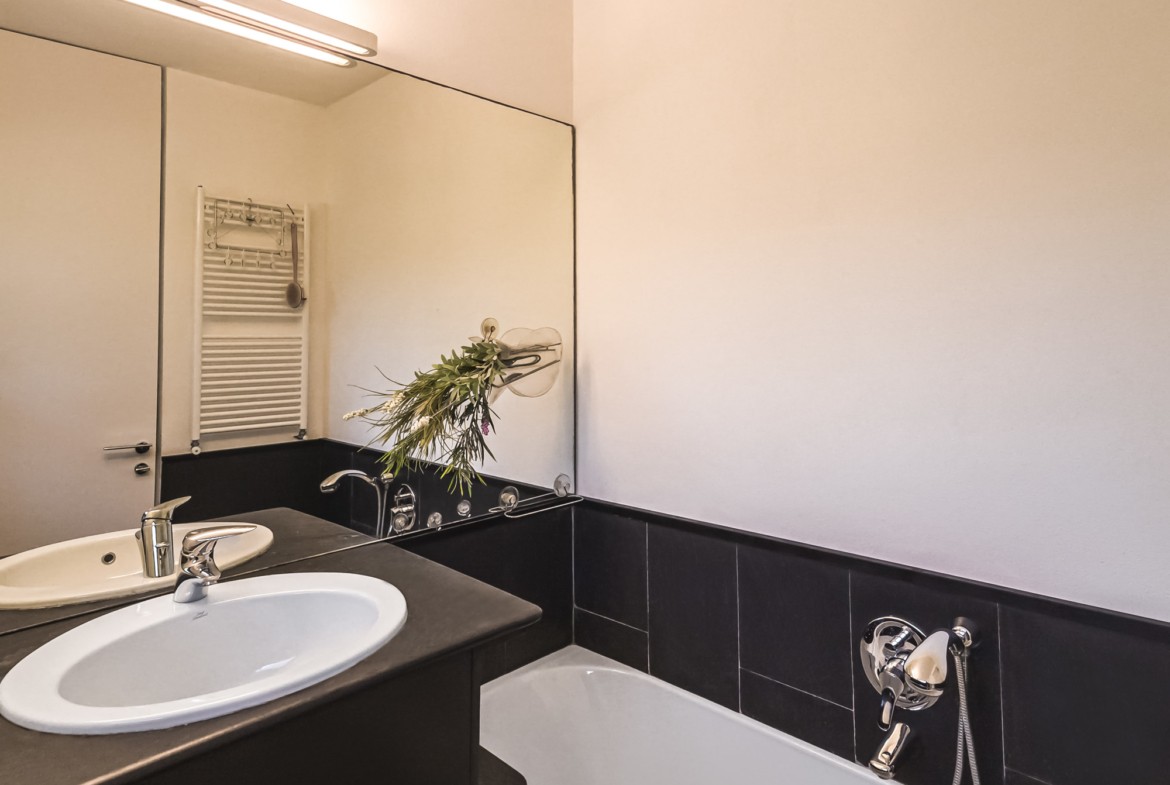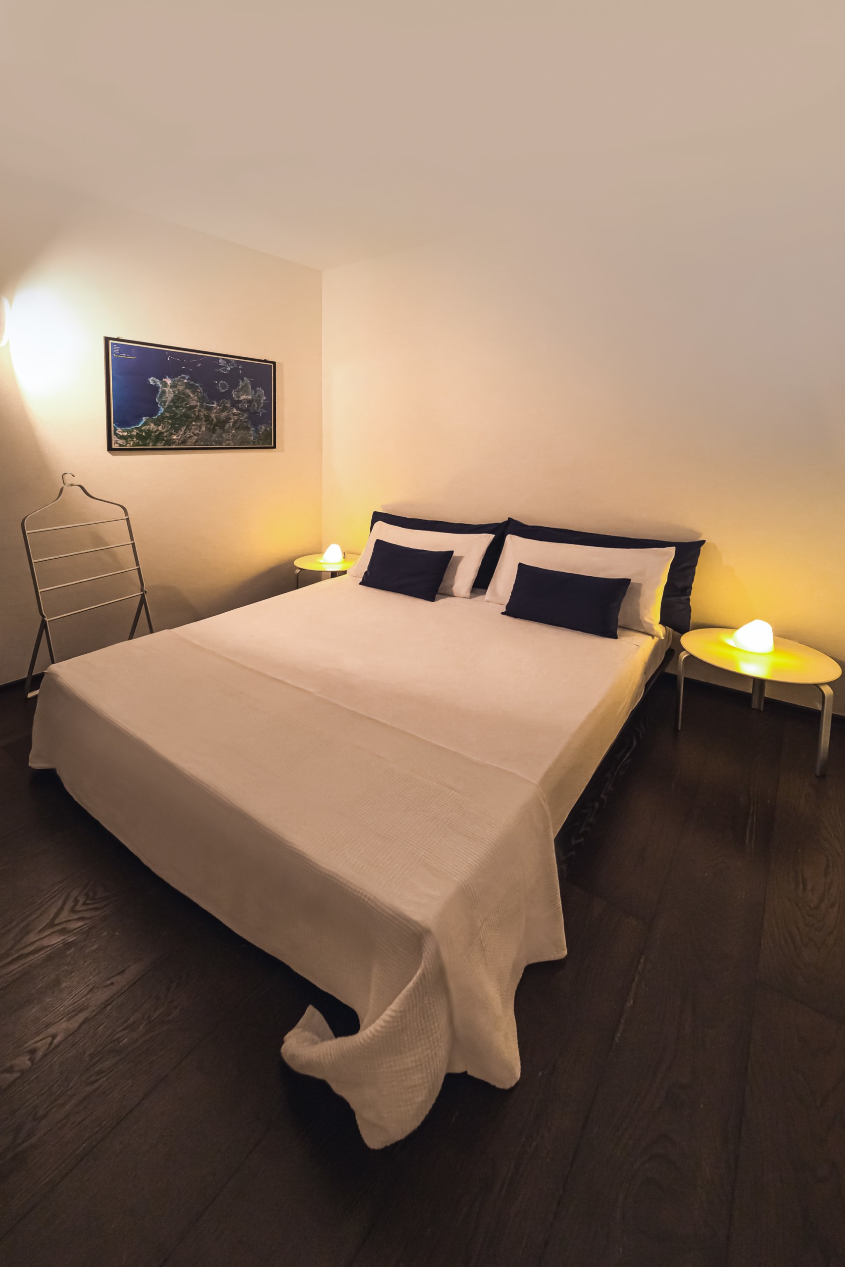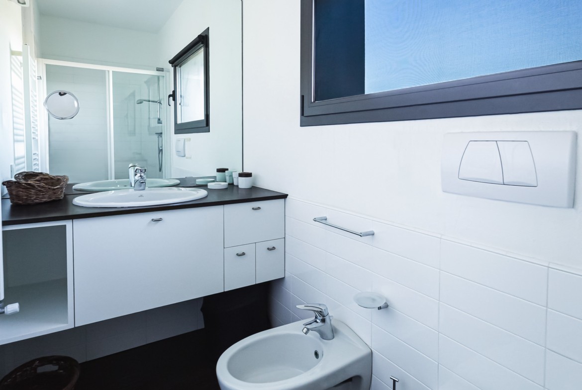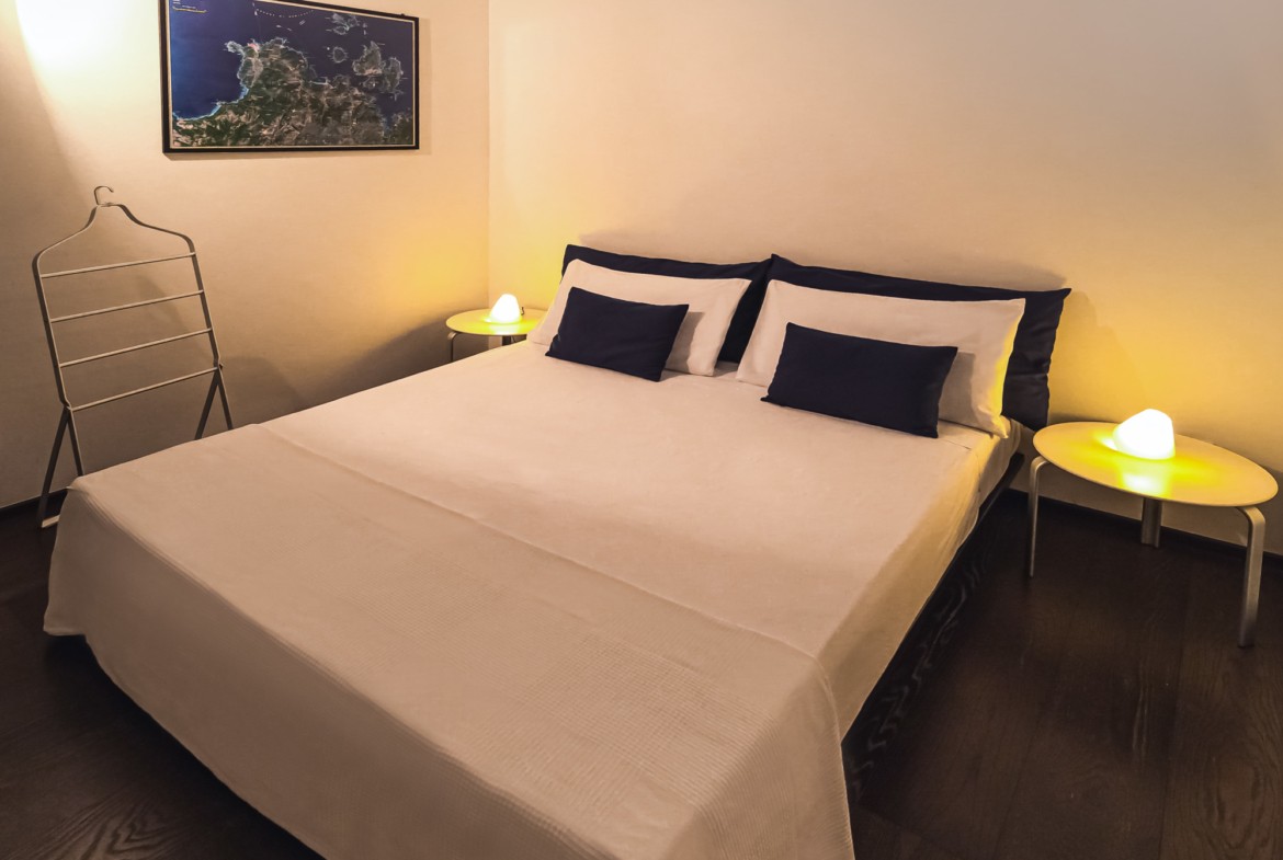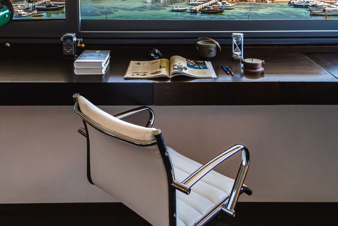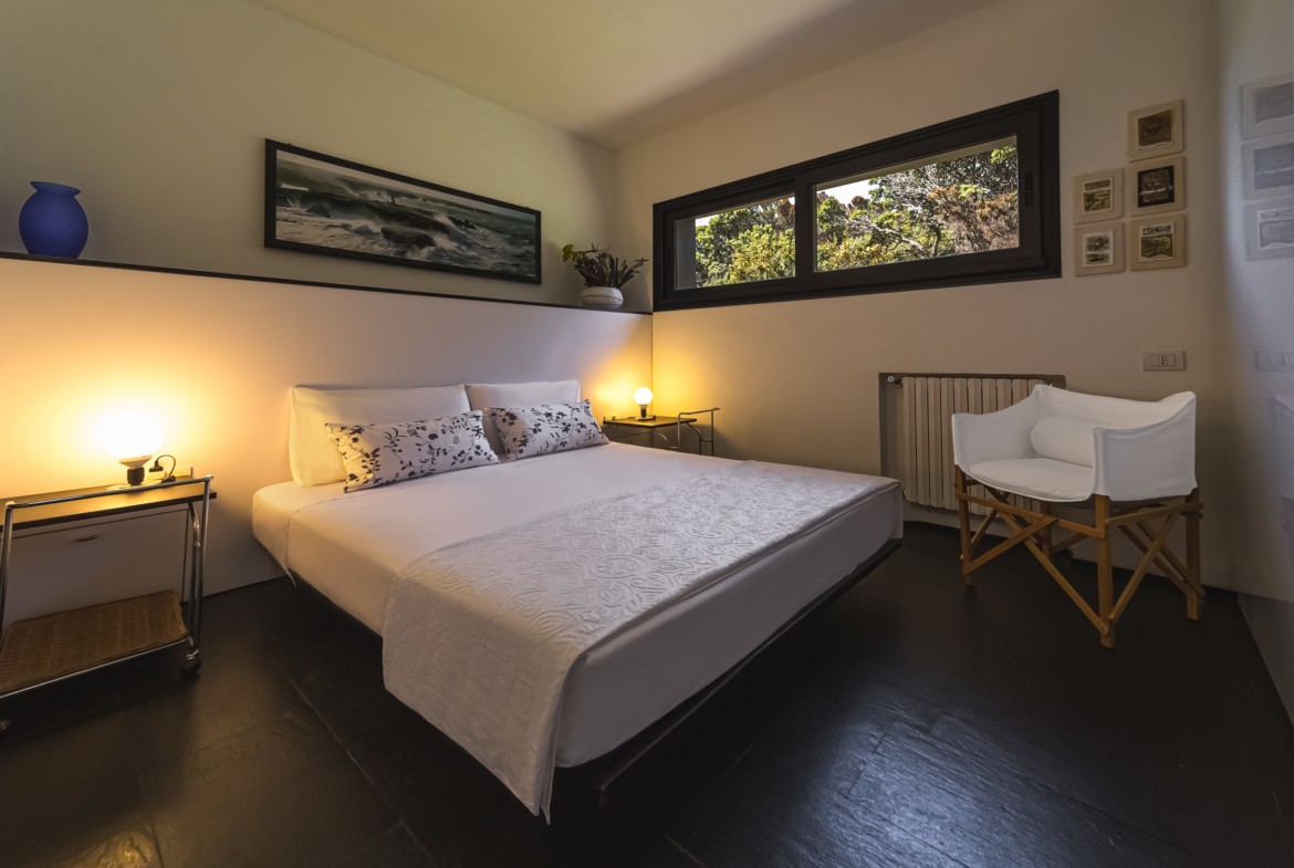 Sviluppata su due piani, al piano terra è composta da una zona living con cucina separata ed una camera matrimoniale con bagno ensuite. Davanti al soggiorno c’è uno spazio terrazzato con doghe in legno (deck) che costituisce il proseguimento del soggiorno, attrezzato con sdraio e tavolino per il relax all’aperto; sempre all’aperto e nella zona antistante la cucina, è stata organizzata una gradevole e riparata zona-pranzo con grande tavolo e tendalino per ripararsi dal sole. Al primo piano è composta da uno studio-soggiorno che attraverso una grande finestra a nastro che si affaccia sul porticciolo sottostante., da una seconda camera matrimoniale con bagno ensuite e da una camera a due letti singoli con un terzo bagno.